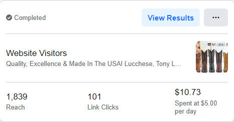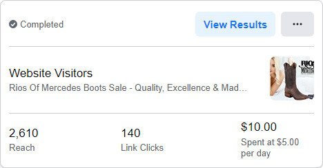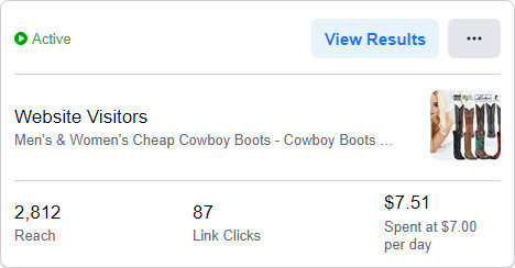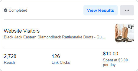 P.S. That reminds me of a little more info: On my ads, I did play around with the age range, and set the ads to a slightly higher age since the boots contained on my site are pretty high end. I also adjusted the location and made them mostly western states. I had an ad that was pretty broad (cheap cowboy boots still currently running) and I had an ad for 1 particular boot that was pretty specific. Unfortunately in Facebook ad manager I could not specify that in the section for detailed targeting.