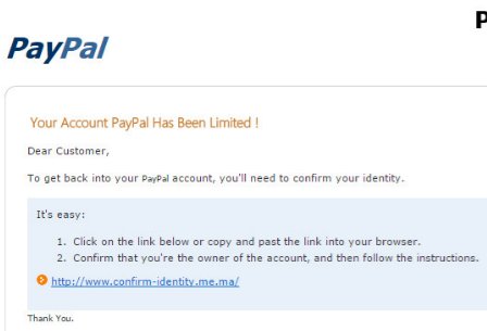 Your PayPal account has been limited, To get back into your account you'll need to confirm your identity. It's easy: Click on the link below or copy and past the link into your browser. Confirm that you're the owner of the account, and then follow the instructions"