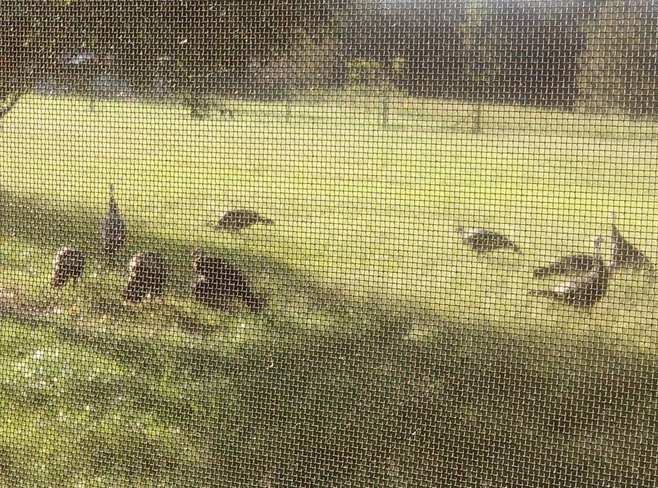 When I first woke early this morning it was to a strange sound outside my window. I rolled over and had to get my phone to capture this image: 10 turkeys!!