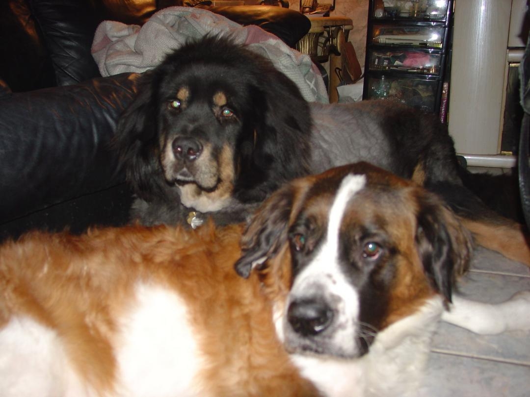 Anyway, you've all met Boo Boo and Ruby, and I wanted to take a moment to introduce you to some of our furry family who are no longer with us. Ted was our very first Tibetan Mastiff, adopted before I knew anything abut the breed, and Cleopatra, who was a puppy mill St. Bernard. They were quite the pair. Here are a few photos of them.