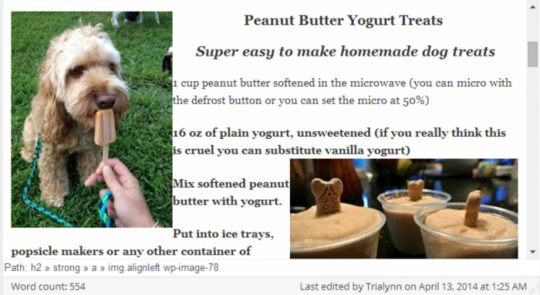 The reason for your text dropping below the image is that you have the image included in the H3 tag for the title. A H3 tag will put anything after the closing tag on the next line. Since your image is within the tag, with the end of the tag being after the title "Peanut Butter Yogurt Treats", it cannot include any other text beside the image, it drops to the next line - ie, below the image. Hope I've explained that clearly ;)