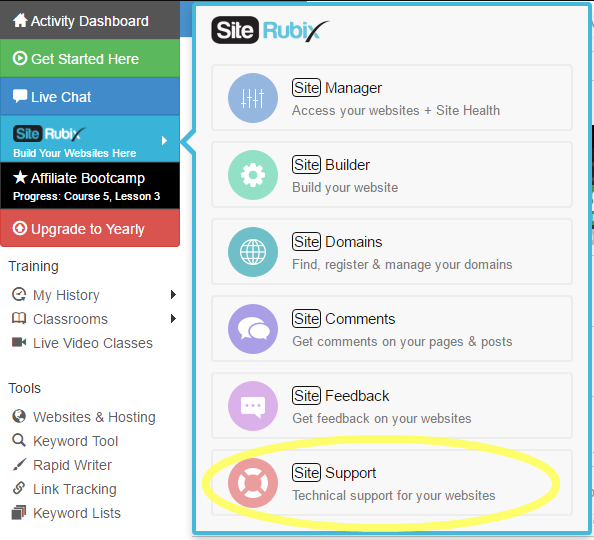 If you need support for your site, just click the "SiteRubix" button toward the top left of any WA page.