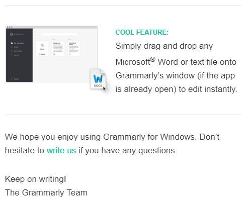 I have just downloaded 'Grammarly for Windows' and have subsequently received a few follow up emails. Below is an excerpt from the latest.