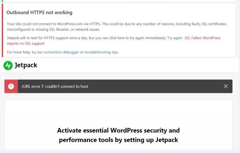 After pressing the Install button for Jetpack, the plugin did not install - however there was the following error notification. (see below pic)