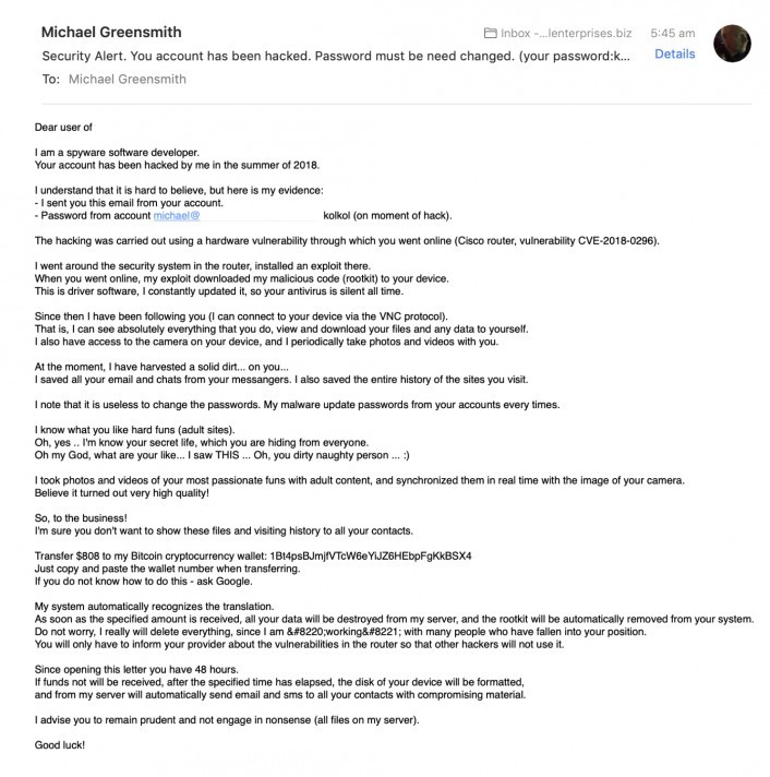 Wow Michael. This is some crazy stuff! I’ve gotten quite a few scam demands but hadn’t seen this particular variety with the bitcoin request. I’m guessing they target men but I’ll be on the lookout and spread the word.