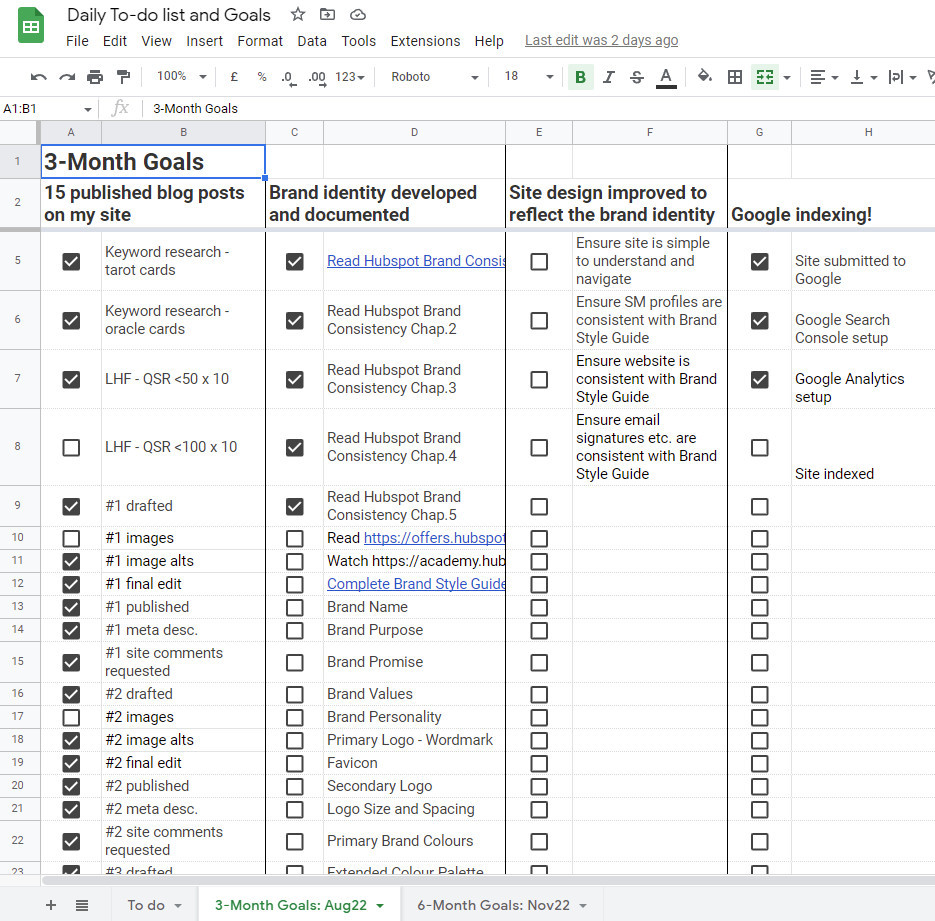 The other side to this Google Sheet is my Daily to-do list, where I will pick the tasks to work through each day. And most importantly for me, I only put in the tasks that I can realistically complete on that day to avoid feeling overwhelmed or discouraged.