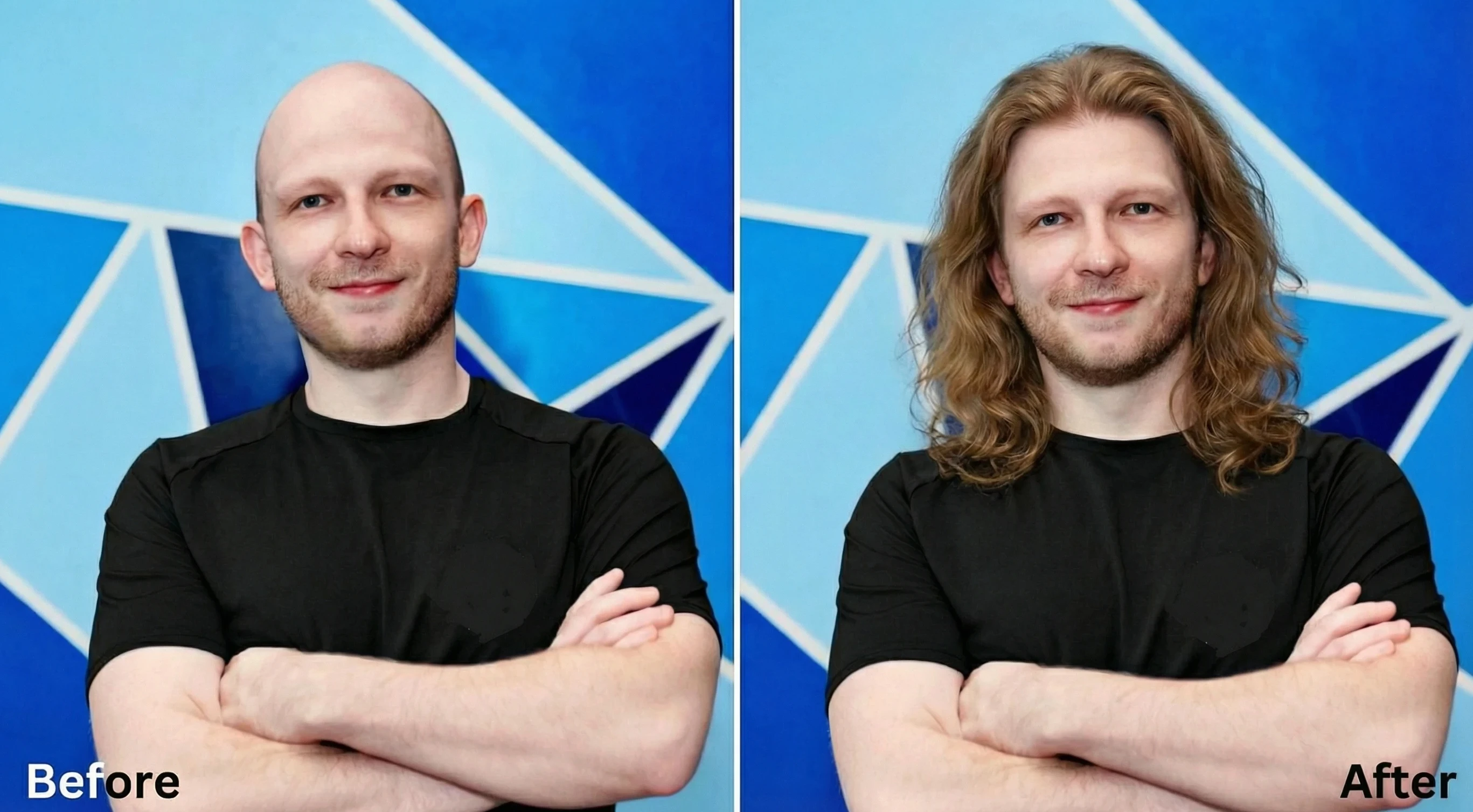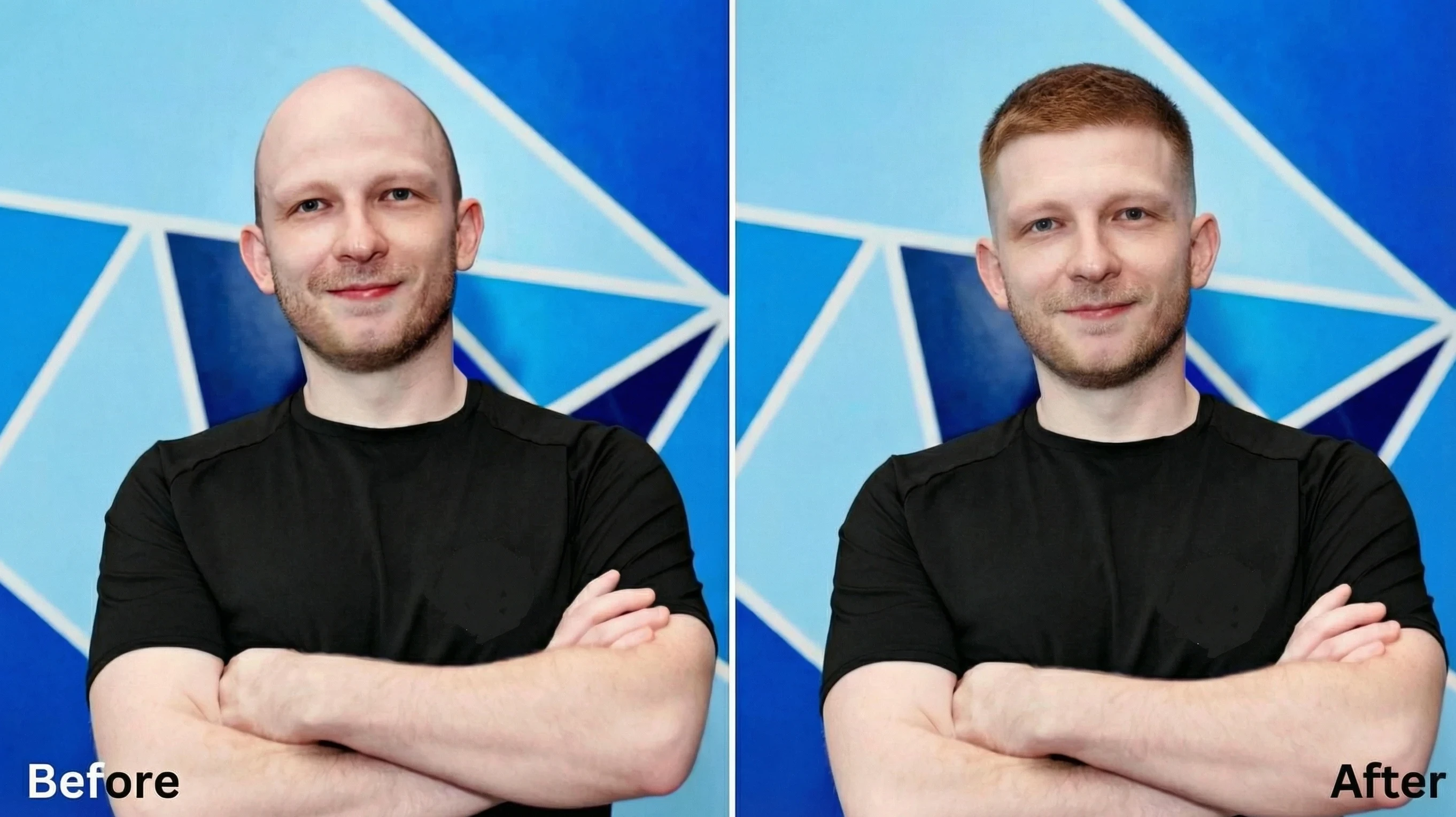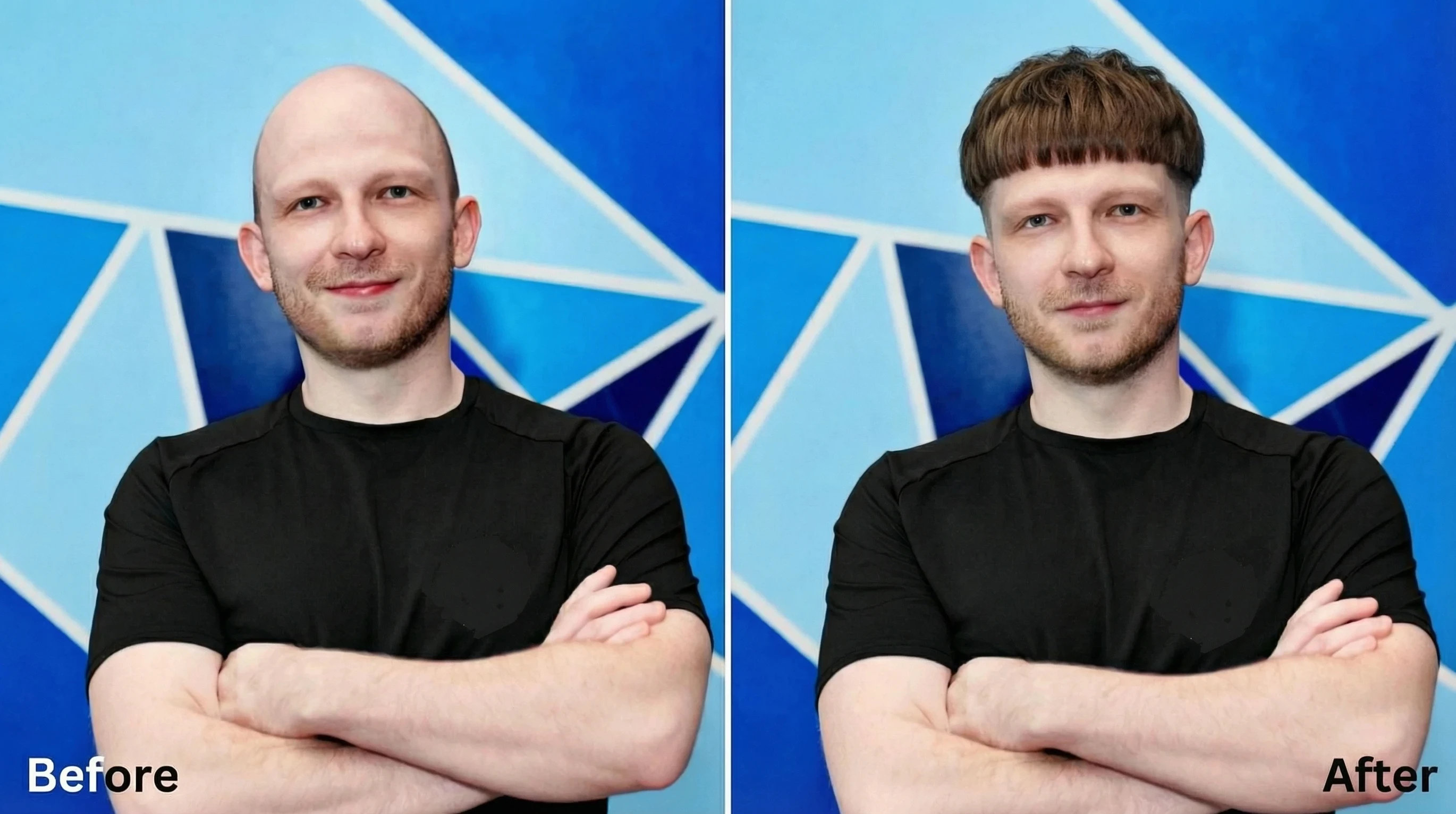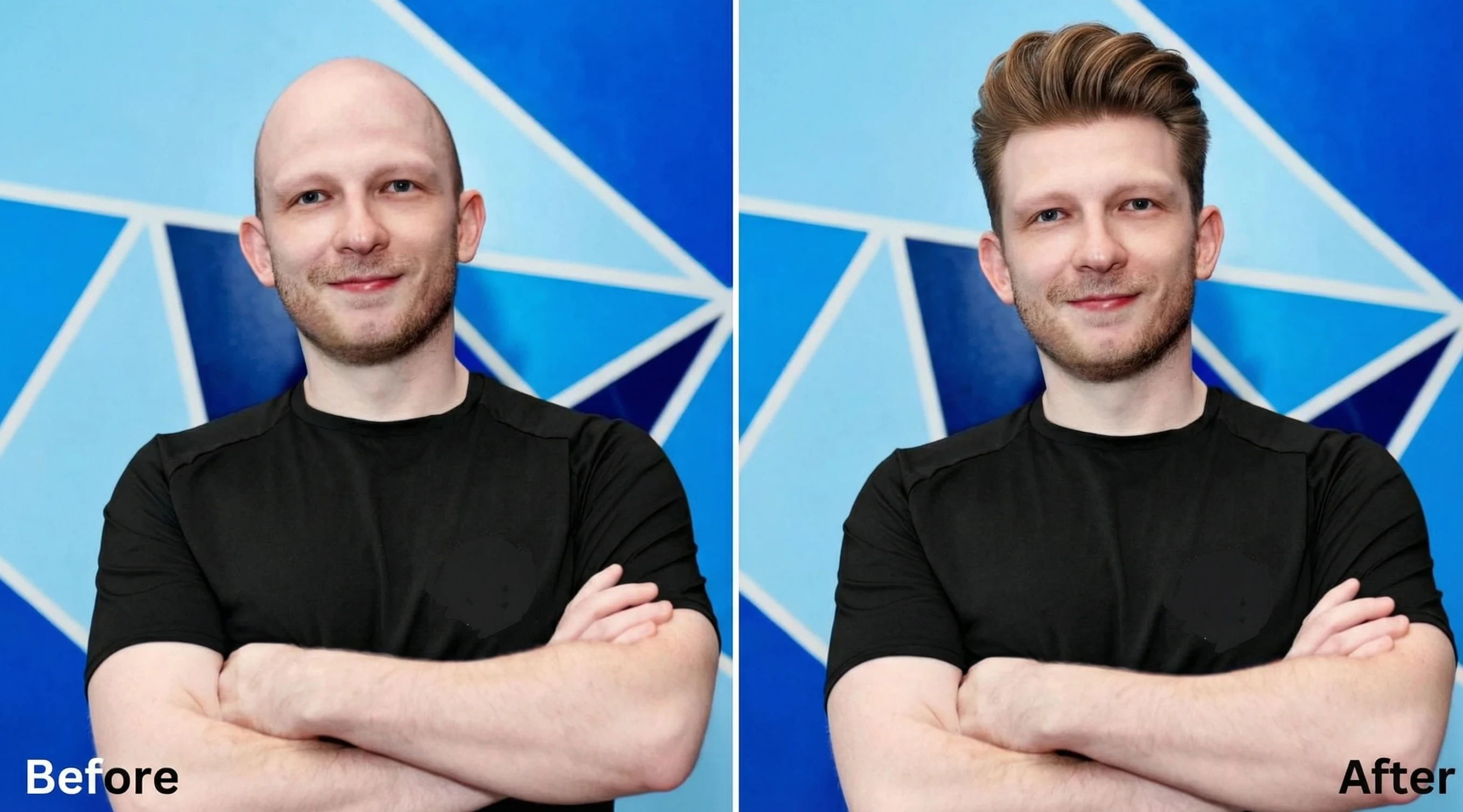 "Create a side-by-side comparison between hairstyles. The before picture will be left alone. The after photo will have a men's pompadour with light brown hair."