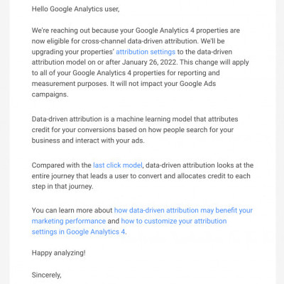 Hi WA. Happy Sunday or Monday. I want to share an email I got from Google. Wanted to see if any of you know what it means exactly. If you know what "Data-Driven Attribution" is?
