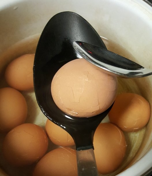 After boiling your eggs, tap them with a spoon all over to crack the shell.