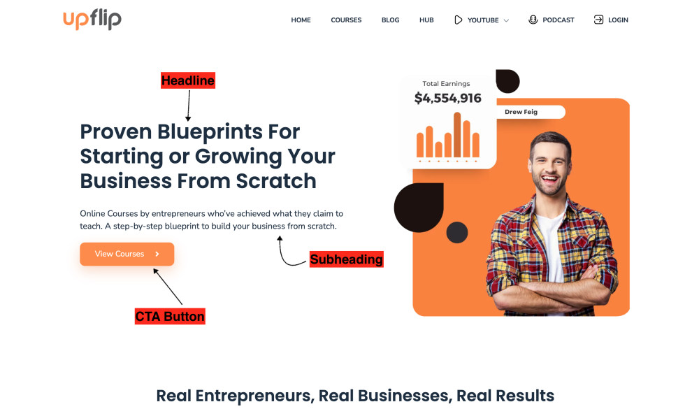 Above the fold consist of 3 sections: headline, subheading, and CTA button.