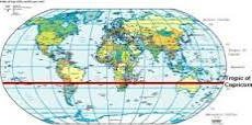 The Tropic of Capricorn, is one of the five major latitude (circles of latitude on maps of the Earth). It lies 23° 26′ 22″south of the Equator, and marks the most southerly latitude at which the sun can appear directly overhead at noon.