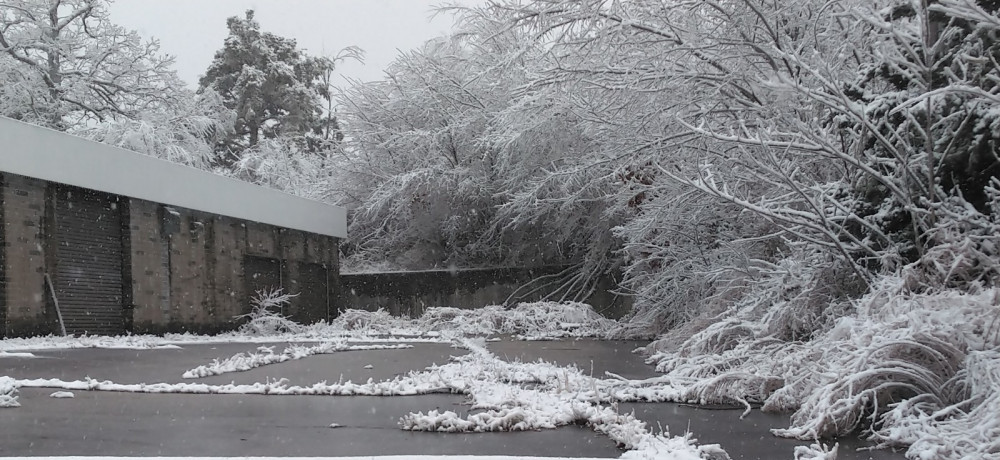 Today wasn’t much better, but we needed groceries, so we headed out into this cold weather. It was just dull and dreary when we left. By the time we got to the grocery store it was spitting rain just a bit. By the time we left the grocery store it had begun to snow, and the temperature was dropping. I caught a picture on the way home; the snow on top of the ice-covered trees is beautiful. I’m lucky to be able to enjoy such quaint scenery.