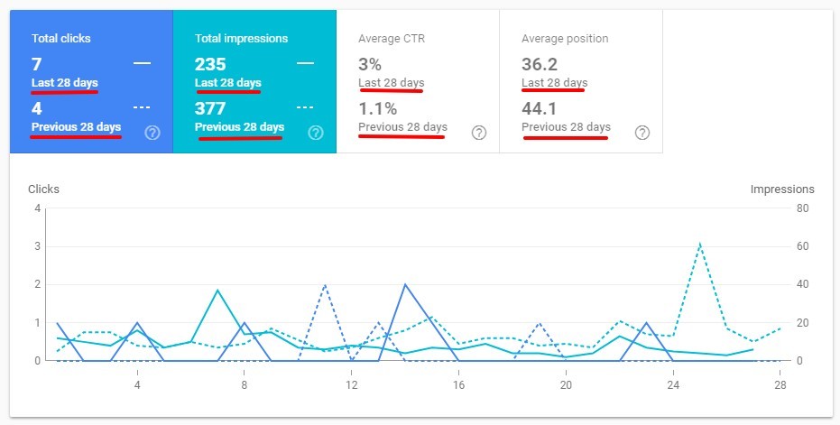 I can see improvement. That's the holy grail, as far as I'm concerned. I compared the current 28 day period to the previous 28 day period, and my rank is improving. Although, I'm not sure why my total impressions dropped.