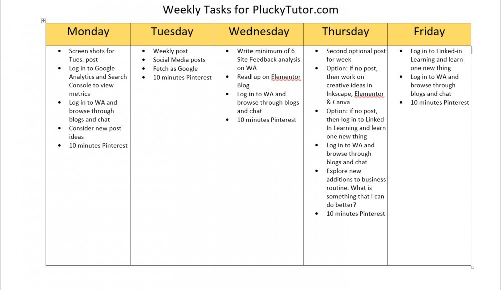 There are certain tasks that I need to do every week with my business. I need to research and do all of the screen shots for my tutorial posts. I need to make sure that the post is ready to go once per week, and that I create images for each type of social media. There are things that I want to make sure I do on the WA site every week.