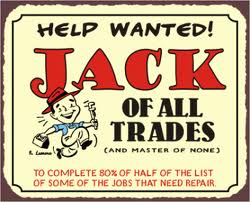 This phrase is one that most people have heard at one time or another. It generally was understood as a common person who had a variety of skills, but was not actually proficient at any. When I researched the term I shouldn’t have been surprised, but Jack was just a common term for anybody and this person was usually a Master Craftsman. Funny how things can get turned around.
