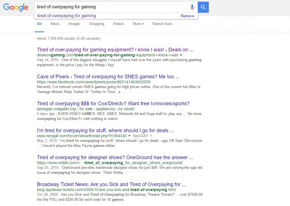 "tired of overpaying for gaming" was the keyword I used for my very first post here at wealthy affiliate. Check it out here: