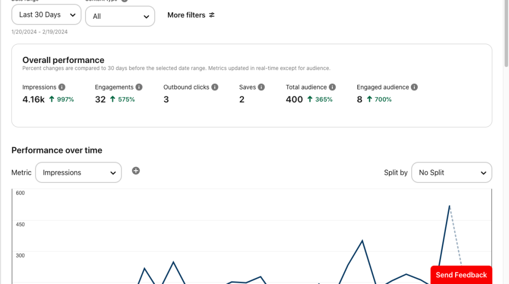 But the thing is I can't stop succeeding (jk), so my Pinterest has actually (yes again) received a lot more engagement, and my first saves and another outbound click.