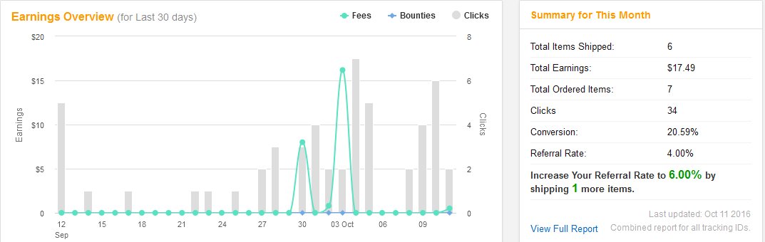 I haven't done anything for a couple months but I decided to check my Amazon Associates account because I heard that if you don't get sales for a while then they close your account so I was worried. To my surprise I actually made some sales! And this was with me doing absolutely nothing at all during the few months I took off. AMAZING! That sure pumped up my motivation again!