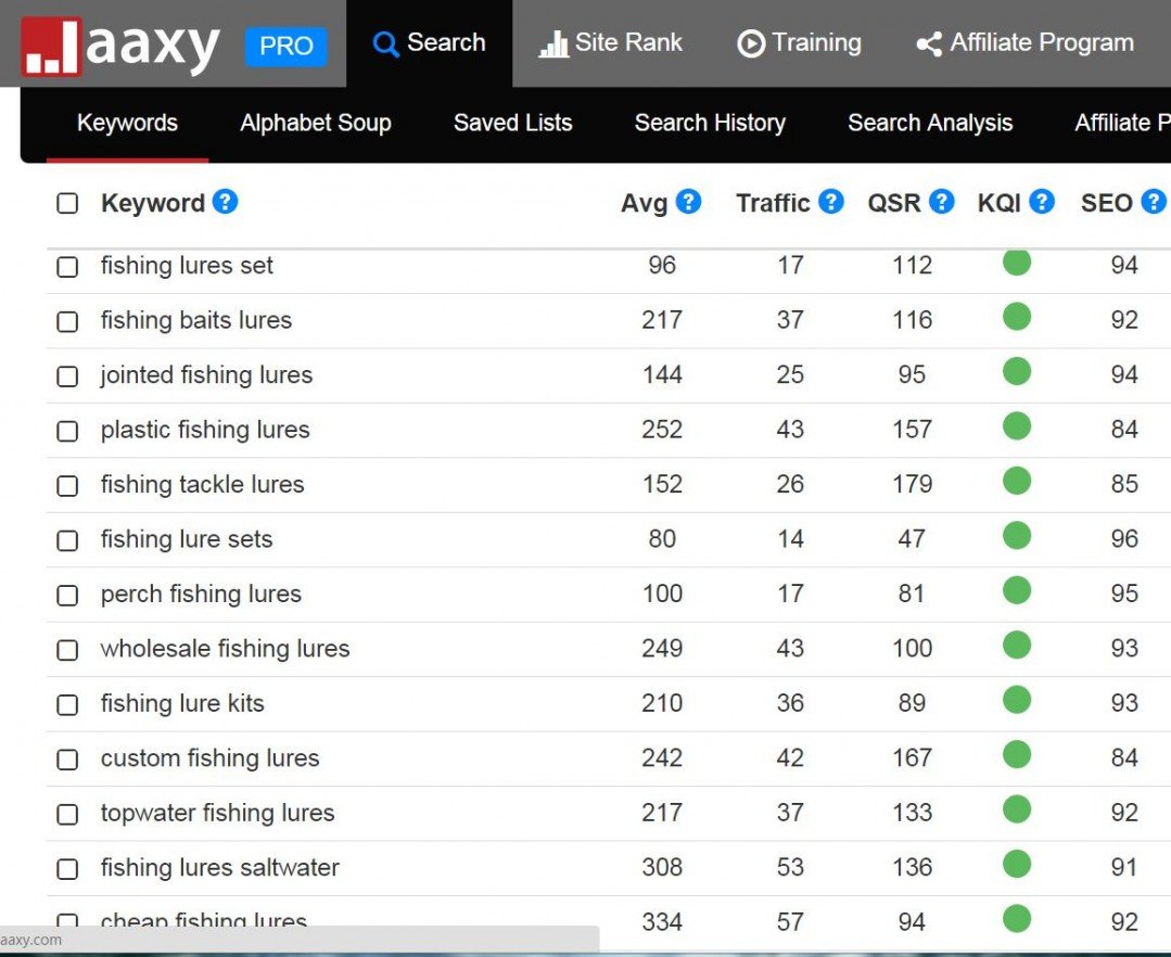 I did a search on Jaaxy for Fishing Lures and the results page looked like this: