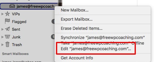 Step 10: On your keyboard, hold down the "control" key and click on the name of the mail account you just added. Then, select "Edit [name of mailbox]".