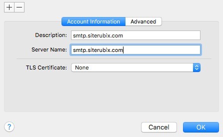 Step 12: For "Account Information", make sure that "Server Name" is set to smtp.siterubix.com and then click the "Advanced" tab/button.