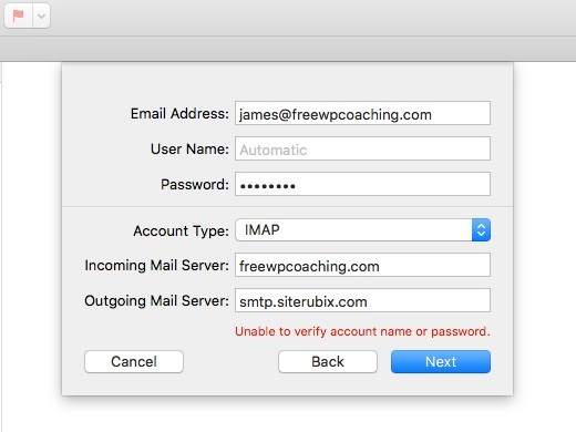 Step 6: A new dialog box will appear that says "Unable to verify account name or password." Enter the information from your WA Site Email Dashboard at https://my.wealthyaffiliate.com/websites/email and then click the "Sign In" button again. IMPORTANT: Don't enter anything into the "User Name" field empty and make sure there aren't any leading or trailing spaces before or after your password.