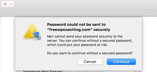 Step 7: Click the "Continue" button in the dialog box that appears that says "Password could not be sent...". (It might take 30+ seconds for this to appear.)