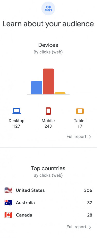 As you can see here, many of my visitors use mobiles and my three top countries are US, Aust, and Canada. What I have learned from these results is that many of my visitors use mobile phones, so it's essential that my website remains mobile friendly.
