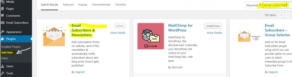 The specific email subscriber plugin that we were introduced to is a free plugin that is available through wordpress as shown below. You find the plugin on your wordpress dashboard under plugins by clicking on add new. You will then search for it by typing email subscriber as shown below.