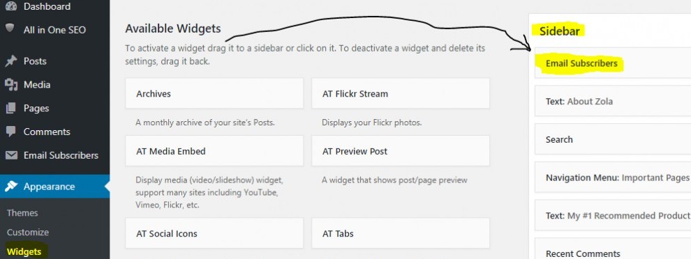 All you need to do in order to make use of it is to find it under your available widgets. You then drag and drop it onto your side bar at the position where you want it placed as shown below. I prefer mine to be right at the top on my side bar so my visitor will not miss it.